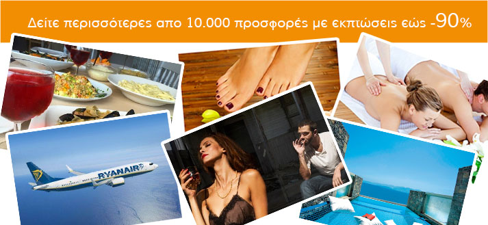Αναζητήστε deals και προσφορές για εκδρομές, ξενοδοχεία, εισιτήρια, spa και μασάζ, περιποίηση και ομορφιά, ψυχαγωγία, διασκέδαση, φαγητό και ποικίλες άλλες, από την άνεση που σας παρέχει ο ηλεκτρονικός σας υπολογιστής και το σπίτι σας!