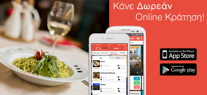 Βρείτε εστιατόρια με προσφορές, δείτε όλα τα τελευταία νέα των καλοφαγάδων και τις κριτικές και απολαύστε γεύματα ισάξια των απαιτήσεών σας! Χωρίς κουπόνια και πιστωτικές κάρτες, με κρατήσεις στο όνομά σας και χωρίς να χρειάζεται να πάρετε κάποιο τηλέφωνο!